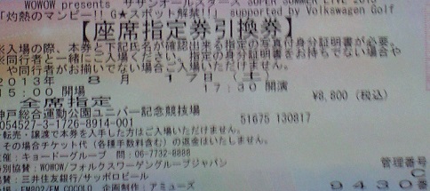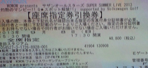 でもなんか日産が昨日のことのようです。はい。 ほんま年月を感じんねなあ。 桑っちょが死にかけたのもあってちょっと復活をあきらめてた部分があったので感慨深い。 と、同時にうれしさは史上最大でしょう。ほんまに。 んで、チケットも二会場取れたし万々歳。 今日の分も一般で狙ったが無理やった。くそぼけが。 今回身分証明が必要ちゅーことで、色々時間的に不安なのである程度余裕を持って行った。 まあ、総合運動公園まではしょっちゅう行くんで大体かかる時間は知ってる。 計画は完璧や。 だいたい14時40分出発。16時前には着く予定。 総合運動公園にはその通りついた。 まずはHMVの売り場でピーハイ限定盤2500円也を購入 まあ、地獄になるのもわかってた。 オリックス戦でもこれくらい人来たれや。 グッズ売り場はまあ、予想ほどでもなく割りとスムーズ。 代官山通信特別版1500円也 ピンクのツアーT3500円也 扇子1000円也 帽子2000円也 メッシュバッグ500円也 ボトルホルダー500円也 ツアーパンフ1500円也 タオル、携帯カバー売り切れ也。早すぎやって。 んで球場が休憩場になってた。球場に桑田佳祐のケイを足してきゅうけいじょう。なんつって。あほか。 ええ風が吹いてて涼しく、人がいっぱいいた。 ここで白鶴上撰カップ購入。 それにしても熱中症には相当主催者側も神経をとがらせていて、そこらじゅうでアナウンスが。 まあ、去年は雷で死者出たのがあったり、今年もゲリラ豪雨で救急車大量に出たとかあったので。 まあ、そこは史上最強晴れ男のわしのおかげで安心。 主催者はわしに感謝の印を送ってくるように。現金しか受け取らない主義なのでそこは汲んで欲しいところだし、本当の誠意というのは数字に表れるものが一番いいと思う。 そして何より物をあげる時は相手の一番欲するものを選ぶのが本当の思いやり。 これで人格のほどをはかられると思ったら安いもんやろ。 でも、5年前の日産では涙雨を降らしたけどな!かっこいい!わし! まあでも16時を少し過ぎたので余裕を見てそろそろ・・と思ったら地獄第二弾はすさまじかった。 今回のライブでは身分証明証を見せて入場口に通してもろて、入場口でチケットを見せて座席の券を機械で発券して貰うって形やねんけど、この発で券機がトラブルを起こしたと。 それで列が混雑で恐ろしいことに。 途中お茶の売り子もおった。 冷えはいまいちですが~の声に笑いが起きた。 暑い中待たされて混乱起きんかったんはこの兄ちゃんがストレスを和らげてくれたおかげ。 まあ、んでも無事入場。 ここでメシ買おうと思ったが全部売り切れだった。 めでたくポテロングが晩飯になりましたと。 もうちょい用意しとけやくぞぼけが。 いやな予感である。 まあ、前から6ブロックということだったのでそれなりに近い。 日産初日もこんなポジやったな。 ということは名古屋では日産二日目と同じくアリーナのいいところ・・なんてな。 ちなみに通路脇だった。 わしは通路脇率が異様に高い。ほぼ全部ちゃうか。 FC抽選はええとこにあたりやすいんやろか。 通路脇はほんまありがたい。 んで、開演がかなり遅れたので短めにやるとのことだった。(うそ) いきなり「海」である。 一発目ではわしの観た中ではセオーノのJAPANEGGAE以来の良い出足。 勝手にシンドバッドが今回早かった。 いきなり最高潮にしてくるか。体力持つんか。 と、思ったらトークとコント。今回めっちゃ凝ってる。 そして年齢確認を行ったが今回40、50代中心。 30代が続いて20,60代少ないのが70,10代であった。 まあ、真っ当ですわな。 しかしこの幅広い年齢層が同じイベントを同じように楽しめるのが特別やとおもう。 良いこと。 タバコロードにセクシーばあちゃんを演ってくれた。 これはびっくり。寄る年波なんていう言葉をロックのリズムによく乗せたなと。 オススメの一曲 Moon Light Lover これはわしの初生サザン(ソロは行ってたが)、ガールズ万座ビーチを思い出す一曲。 甲子園の風景蘇ってきたっすね。ほんま。感慨深い。 ライブは基本的にガールズ万座ビーチのツアーTで参戦するようにしている。 今度の名古屋はピンクで行こうか迷うが。 そしてまたトーク、 屋号を返す儀式を執り行った。 神主や巫女さんまで呼んで(?)の厳粛な(?)一幕。 でも、我らがエロオヤジはやはり・・ そして屋号・・ならぬヤゴを返した。 さすがドリフの幻のメンバー桑田。 しかもマニアックなトンボやと言う・・敦夫ちゃんいわく。 アコースティックコーナー。 5年前は涙のキッスが良い曲だと気づけたコーナー。 そう。あのゴテゴテアレンジはやっぱ良くないんだよと一人生意気言ってたあのころ。 日産では台車に乗ってサブステージに移動したが、今回あれは時間の無駄になると自粛。 しかしアコースティックでNever Fallin' Love Again。 サクソホンがいい心地やないか。 太陽は罪なやつ CDで聴くことはあまりないが、これは観に行ったらぜひやって欲しい曲。 これとホテパシ、ロックン