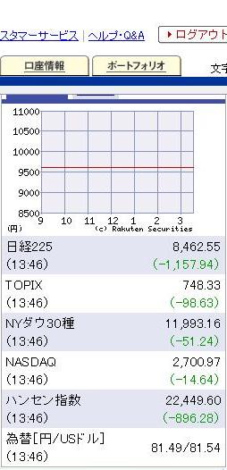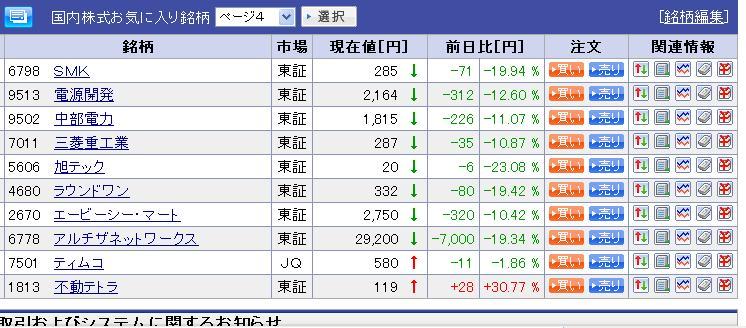 経験者が多く、的確なサポートもできそうな感じなので良いと思います。 これを機に関西そのものも盛り上がると思いますな。 被災者より落ち込んでたらあかんと思いますもんな。 http://www.youtube.com/watch?v=JBqOW00_ins こんなおっちゃんもおるんやからね。ほんま。 わしやったら家失って恐怖にさらされてあんな顔でけんで。絶対勝てんわ。 阪神での被災者も多数ボランティア希望が出るでしょうな。 ほっとかれへんってのはあるはず。 わしも家一軒あまってるから足らんかったら言うてよ。生ズーズー弁も聞きたいし。 被災していない地域はいつも通りやるべきとの意見も多数聞きましたが、まさにそれが求められるところに来ましたな。 わしも知り合いが仙台におります。 青葉区で東北福祉大学で働いてるはずなので大丈夫と思うが・・ ほんま、日本全国。他人事じゃないと思います。 陛下のお言葉。 装飾のない、シンプルなことがいかに大事か知らしめました。 特別なことは何もおっしゃらず、しかも、速報などあれば中継を切ってそちらを優先せよとのご要望。 こういう配慮が日本人に欠けてきたと思うので、わしも見習わんといかんと思わされた。 日本の象徴っていう意味がマジでようわかったわ。 しかし、これを被災者にお聞かせできないのは残念。 特にお年寄りには力になろうかと。 どっかの元都知事とは違って真実味がありますがな。 装飾しようばっかり考えるから間違ったことを言うことになるわけで。 あの元都知事の詐欺師は一番今の日本に欠けてる象徴みたいなおっさんやな。今すぐ出て行け。 株のほうはめちゃくちゃ荒れまくり。 日経100円くらい一瞬で値が飛ぶ。 ちょっとくらい買ってみよと思うほど安いですが、手を出せないまま終わった。 価値開発18円とこ見て手が出そうになったんやけどな・・。 というか昨日8500割った時点で行くべきやったなあ。 下値のめどがこの辺なのはわかるやろし。 でも、そんな精神状態になれんほどえぐかったからな。 まあ、買わなければ死なないということで今日は締めます。 3月14日9時20分ごろ。まったく寄らない。 理屈ではわかっててもこれ見たら恐怖を覚える。 東北のヒット曲特集。 疎開となると地元が恋しくなる時期も来るかと思います。 そんな時にご当地ソングの慰めもあって良いかもしれないです。 既に紹介済みではありますが、もう一度・・。 千昌夫 / 味噌汁の詩 千昌夫氏は陸前高田市出身。 歌詞にも「生まれは陸前高田」と出てくるご当地ソングです。 ユニークな唄で一度聴いたら忘れられないはず。わしもガキの頃から好きな曲です。 その、ある種あこがれの陸前高田ももうダメになってしまった。 東北旅行は行ったことないゆえ、次のターゲットやっただけに悲しいっす。 千氏も投資ですさまじい借金を背負ってもタフに生きてきました。 岩手の人は強いのでへこたれん気がします。 さとう宗幸 / 青葉城恋唄 仙台市の青葉区のご当地ソング。 恋愛ソングでもありますが、みたこともないのに情景がぶわーーーっと出てくるすごい歌詞。 これは歌詞っちゅーのにあまり興味ないわしも好きな歌詞であります。 さとう氏もラジオ番組収録中に被災したと言います。 もちろん被害の少ない地域だったので大丈夫でしょうが、恐怖心は消えないです。 わしも大阪での震災の揺れはトラウマの一つでありますし。 霧島昇 / 誰か故郷を想わざる 福島というと会津磐梯山とか思いついてしまう。 ということでwikipediaで調べてわかった双葉郡出身というこのお方の歌を。 いわき市に『誰か故郷を想わざる』の歌碑が建立されている・・というくらいのものなのでご当地と言えるでしょうか。 しばらく疎開もしないといけないほど大変な状況。 こういう歌に力をもらうのも良いのではないでしょうか。 望郷の歌ってのは大切にしたいと思います。 落ち着いた歌声もこういう曲には効き目があるはず。